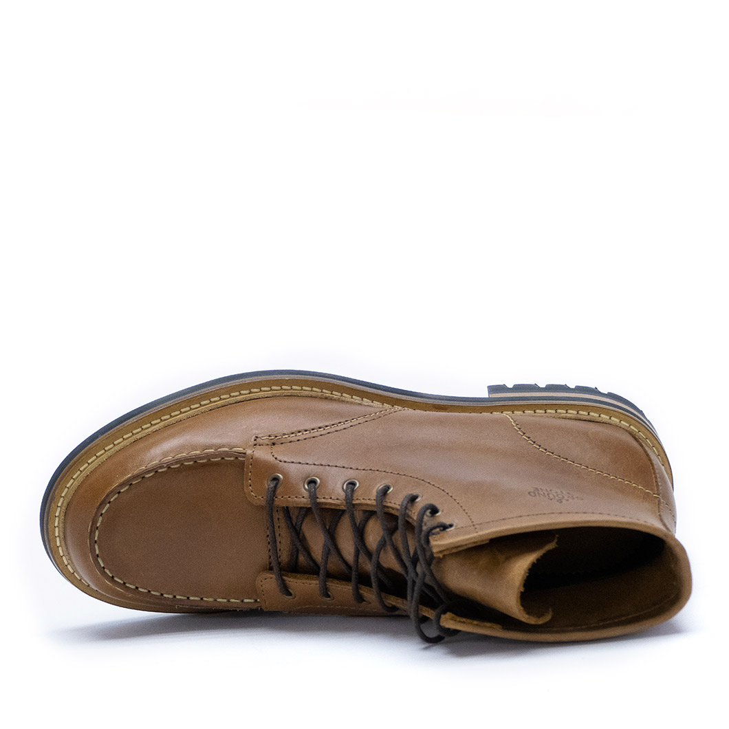 Classic moc-toe boot in soft aniline leather with calfskin lining. Outer sole in rubber with leather welting.