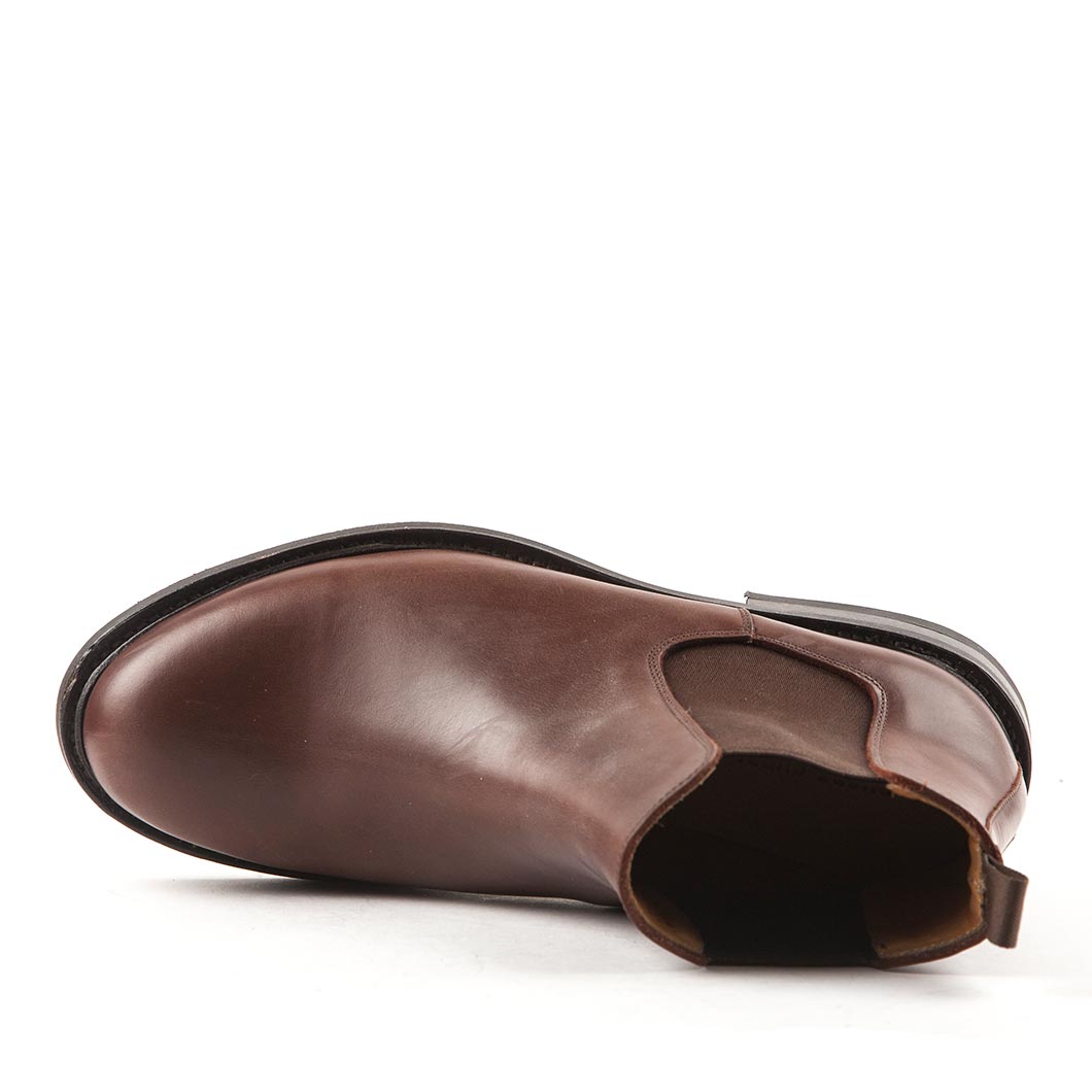 Chelsea boots with sturdy tractor sole in rubber.  Upper in strong, brown, waxed pull-up leather which will age beautifully. Lined with calfskin,